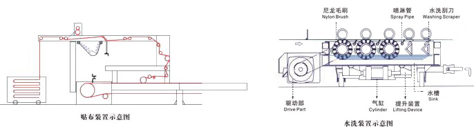 導帶洗濯間接干系到印花品質,本機水洗裝配由3根尼龍毛刷,3根噴淋管及2根刮刀等構成,全部裝配為氣動布局,使導帶能到達最好的洗濯結果。